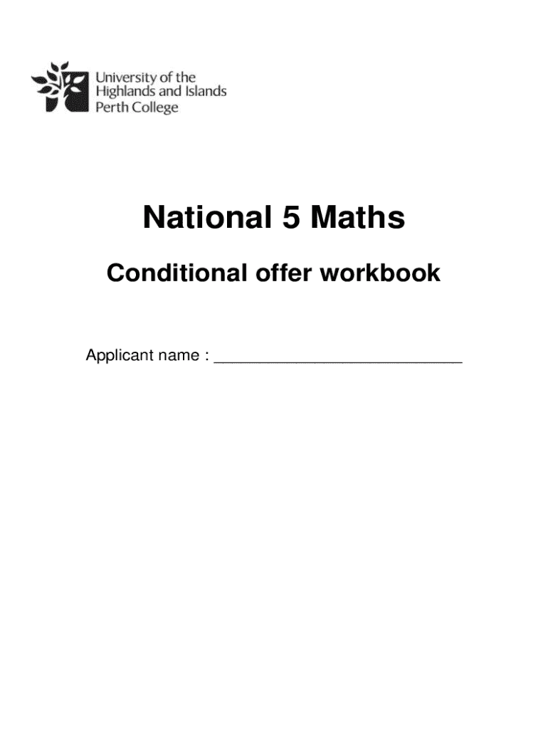 This document is a workbook for applicants who have received a conditional offer for the National 5 Maths course. It aims to help applicants prepare for the course by reviewing essential mathematical