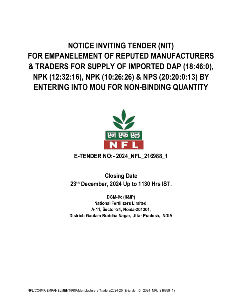 Get the free Notice Inviting Tender (nit) for Empanelment of Reputed Manufacturers & Traders for ...