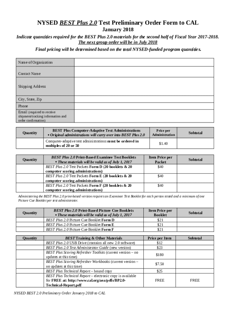 What is Nysed Best Plus 2.0 Test Preliminary Order to Cal Form?