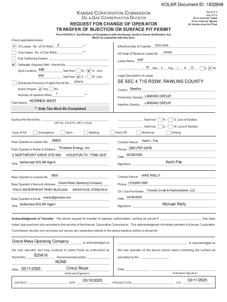 This document serves to request a change of operator for the transfer of injection or surface pit permit in the Kansas Corporation Commission, requiring compliance with additional documentation.