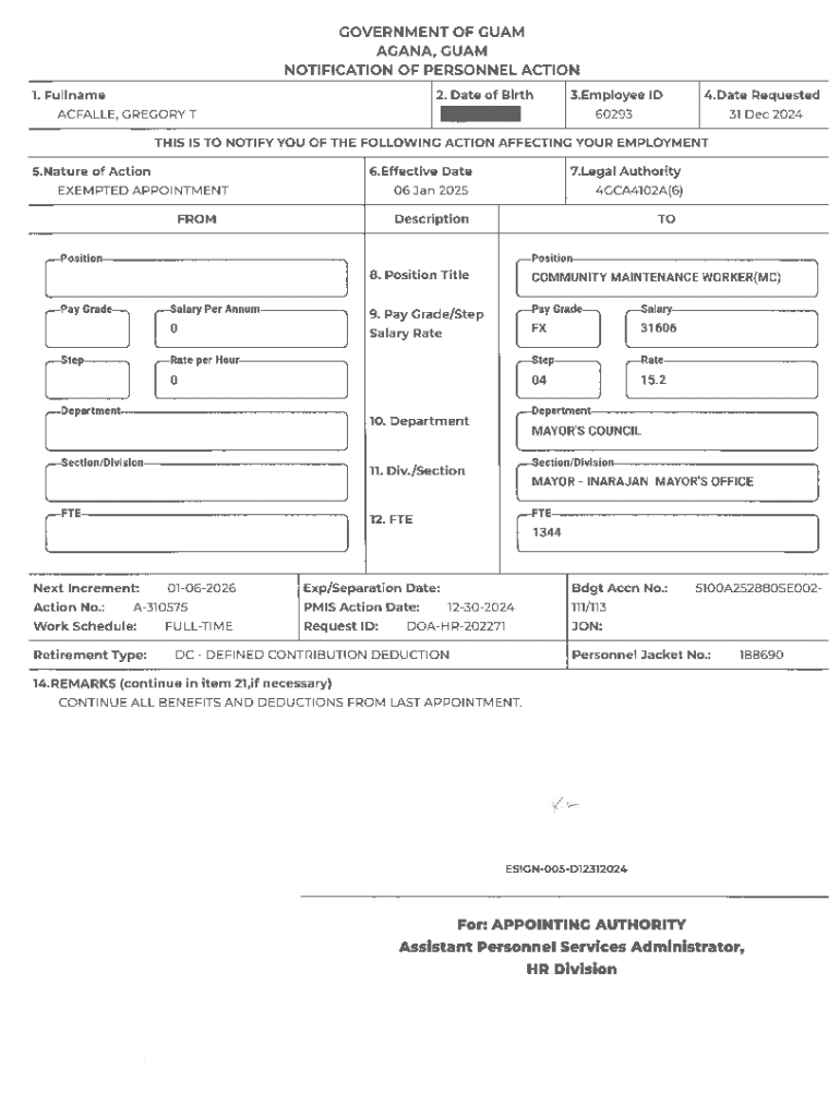 Get the free Notification of Personnel Action - hr doa guam