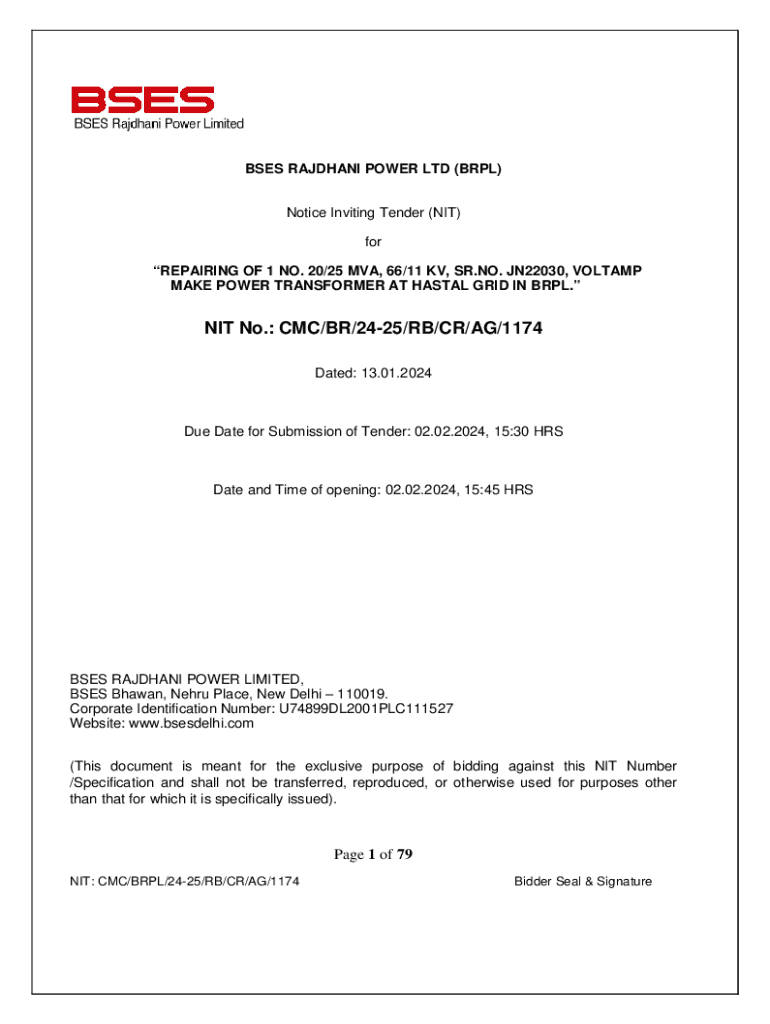 This document serves as a Notice Inviting Tender for the repair of a power transformer in BRPL, detailing submission guidelines, requirements, and conditions for prospective bidders.