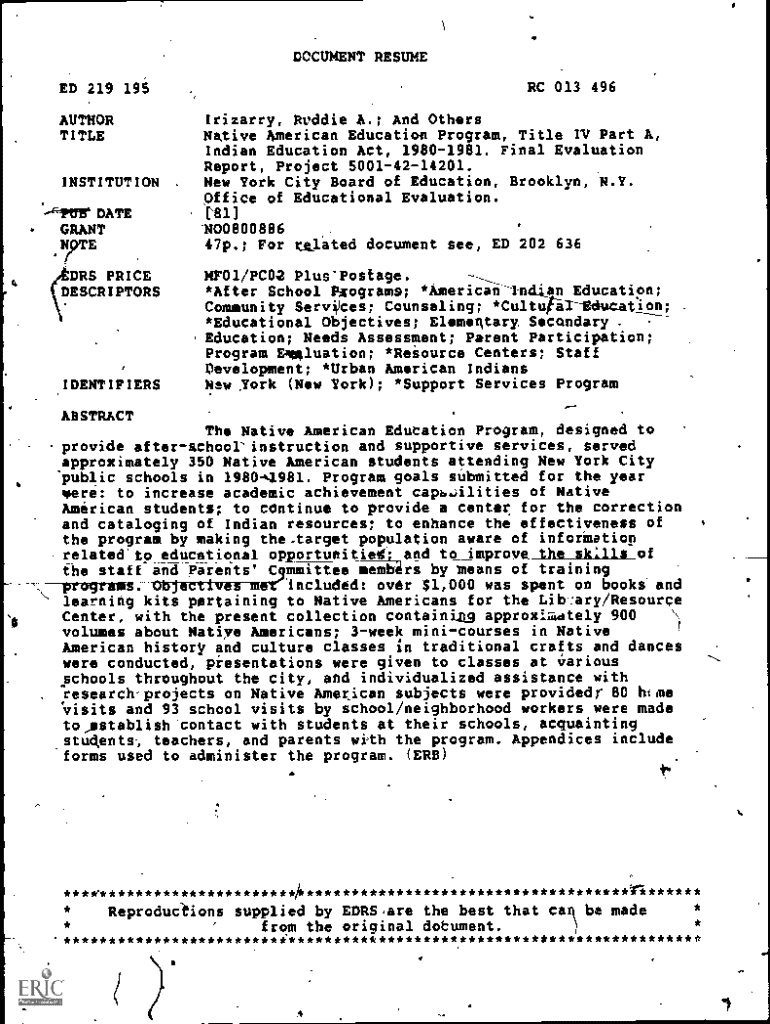 This document provides a comprehensive evaluation of the Native American Education Program\'s activities and progress during the 19801981 academic year, focusing on afterschool instruction and supportive