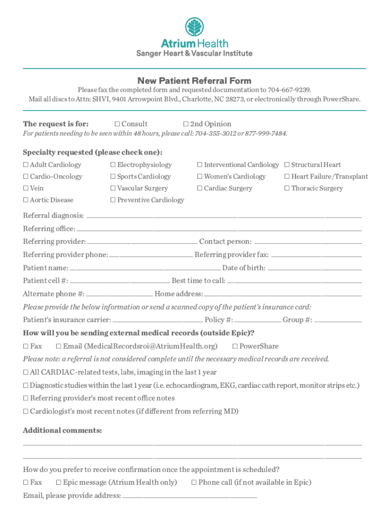 This form is used for referring patients to various cardiology specialties and for scheduling requests such as consultations or second opinions.