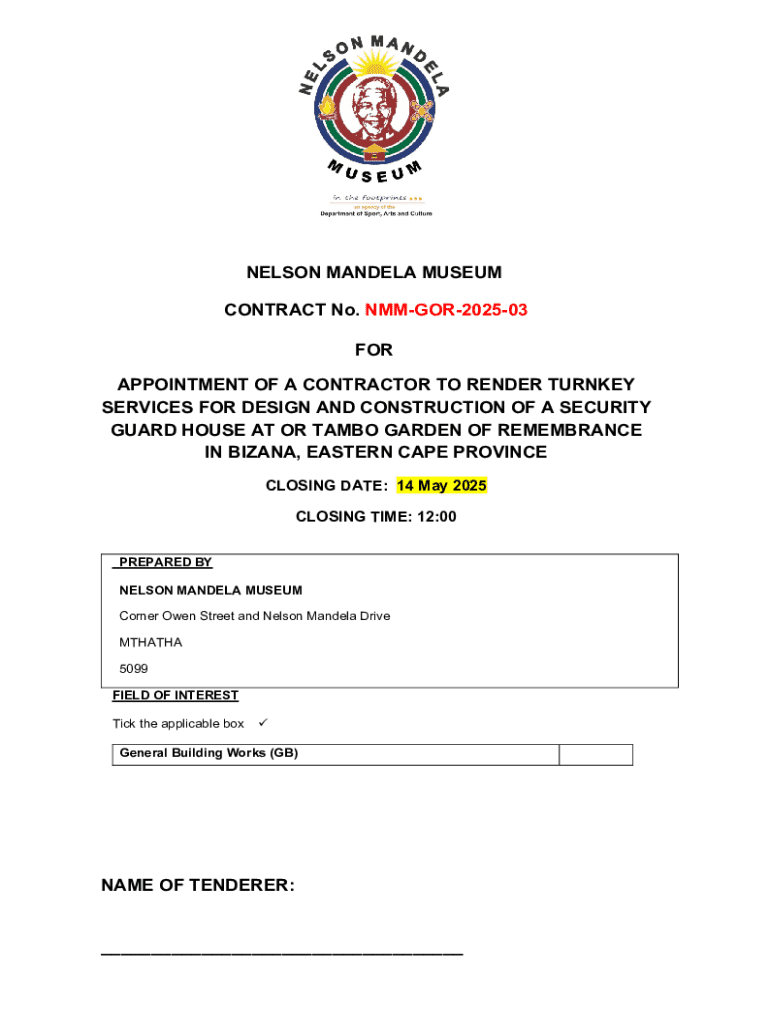 This document serves as a detailed tender for the appointment of a contractor to design and construct a security guard house at OR Tambo Garden of Remembrance in Bizana, Eastern Cape Province. It