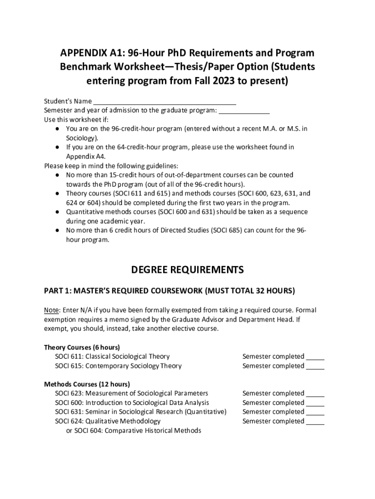 Get the free Appendix A1: 96-hour Phd Requirements and Program Benchmark Worksheet