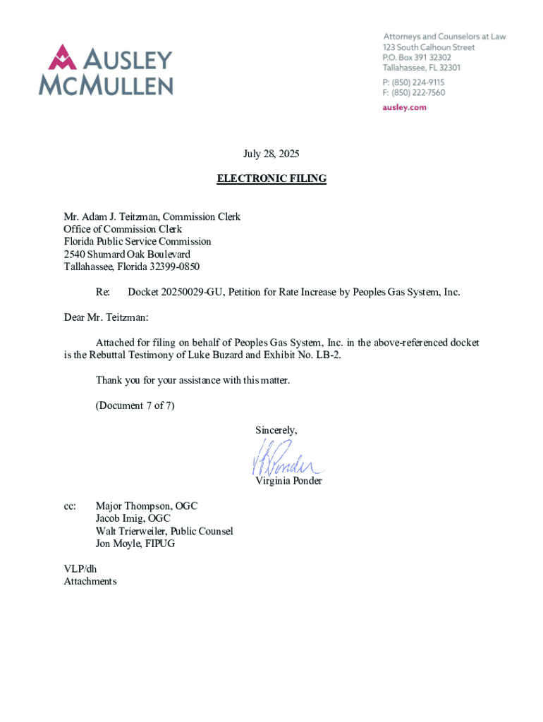 This document contains the rebuttal testimony of Luke Buzard regarding a petition for a rate increase by Peoples Gas System. It outlines the reasons for the rate increase, responses to testimony from