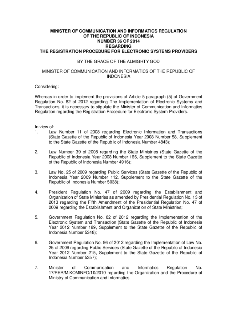 This regulation outlines the registration procedures for Electronic Systems Providers in Indonesia to ensure compliance with electronic information and transactions laws.