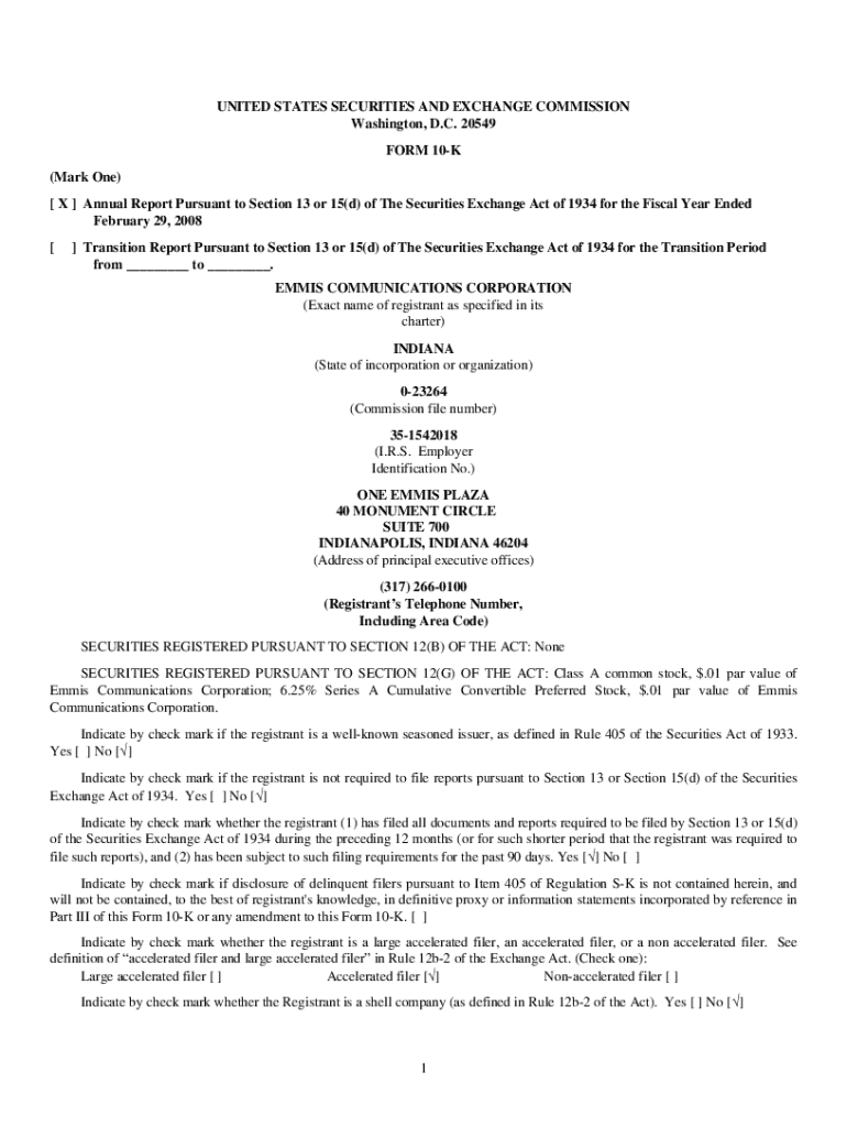 The Emmis Communications Form 10-K is a comprehensive and legally mandated report that publicly traded companies must file annually with the U.S. Securities and Exchange Commission (SEC). This crucial document provides a thorough overview of the company's financial health and operational performance, making it essential for investors, analysts, and stakeholders seeking to understand the company's standing in the market.