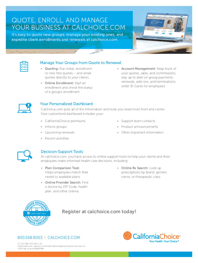This document provides information on how to quote, enroll, and manage groups through calchoice.com, along with the features available for managing business clients and decisionsupport tools for healthcare.