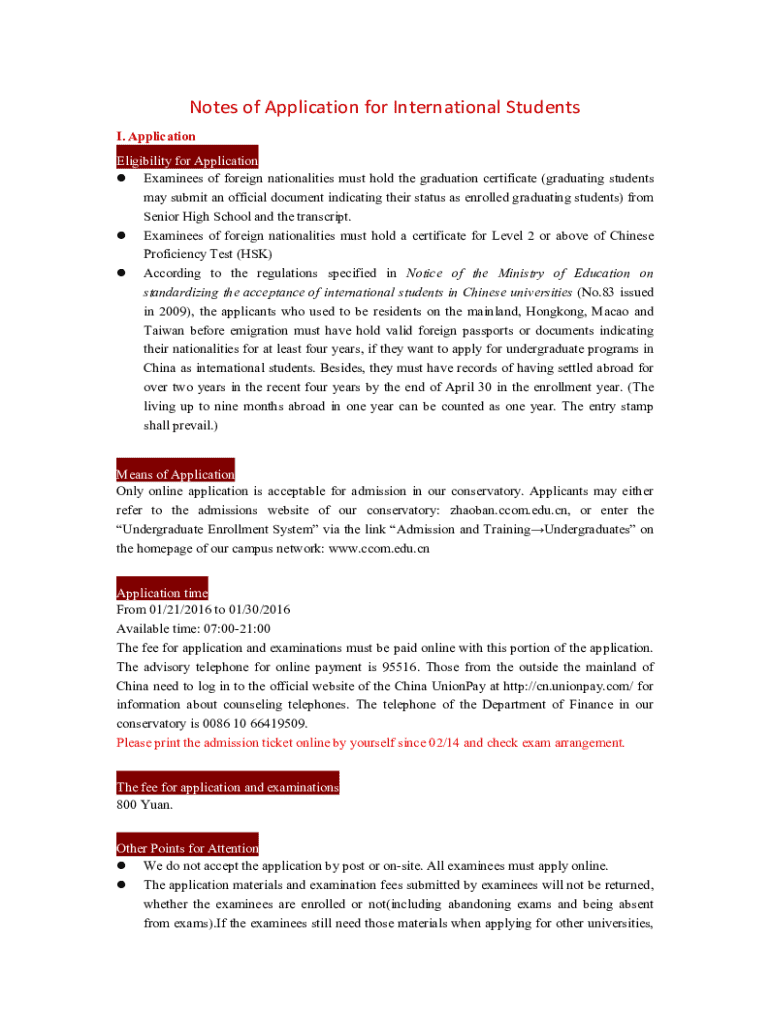 This document outlines the application process, eligibility, and examination requirements for international students wishing to enroll in the Central Conservatory of Music in China.