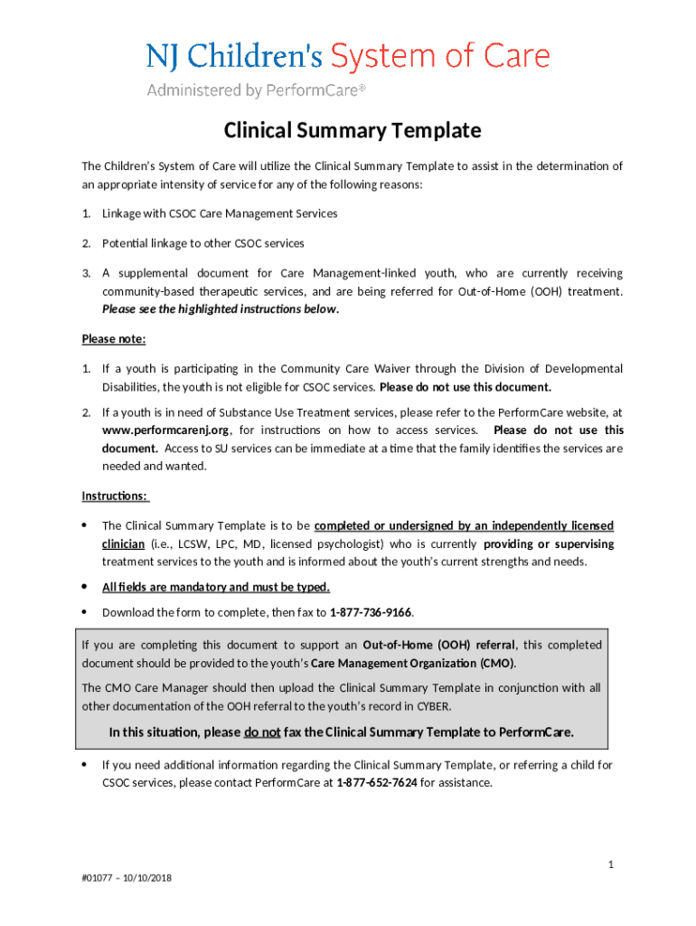 The layout of the clinical summary template form is designed to streamline information entry and retrieval. It typically consists of various sections dedicated to different patient specifics, allowing healthcare professionals to quickly navigate and fill out required fields.