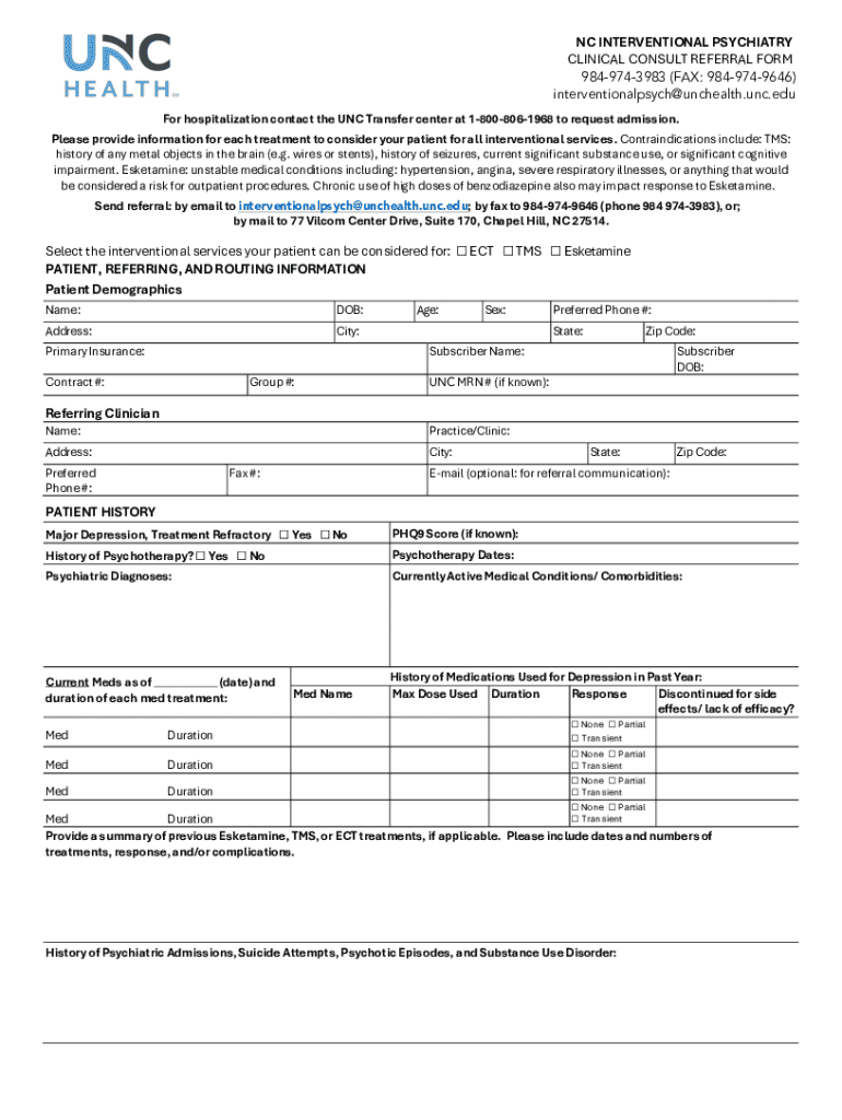 Get the free Nc Interventional Psychiatry Clinical Consult Referral Form