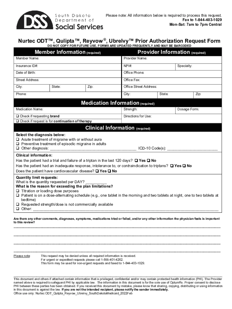 Get the free Nurtec Odt™, Qulipta™, Reyvow ®, Ubrelvy™ Prior Authorization Request Form