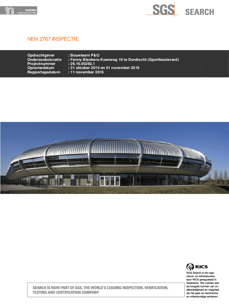 Dit document is een rapport van de technische inspectie van de Sportboulevard te Dordrecht, uitgevoerd volgens NEN 2767. Het bevat gegevens over de opdrachtgever, de locatie, het projectnummer, onderzoeksgegevens,