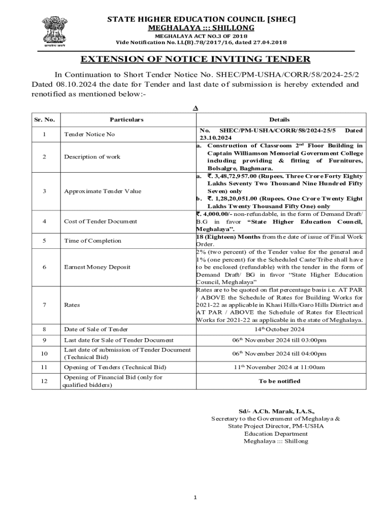 Announcement of extensions for various tenders related to construction and supply of equipment in Meghalaya, including details about submission deadlines, financial requirements, and project descriptions.