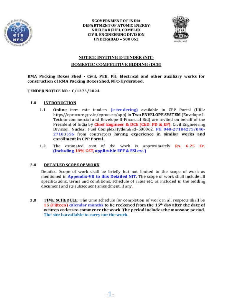 This document invites etenders for the construction of RMA Packing Boxes Shed at NFC Hyderabad, detailing eligibility criteria, submission guidelines, scope of work, and tender evaluation process.
