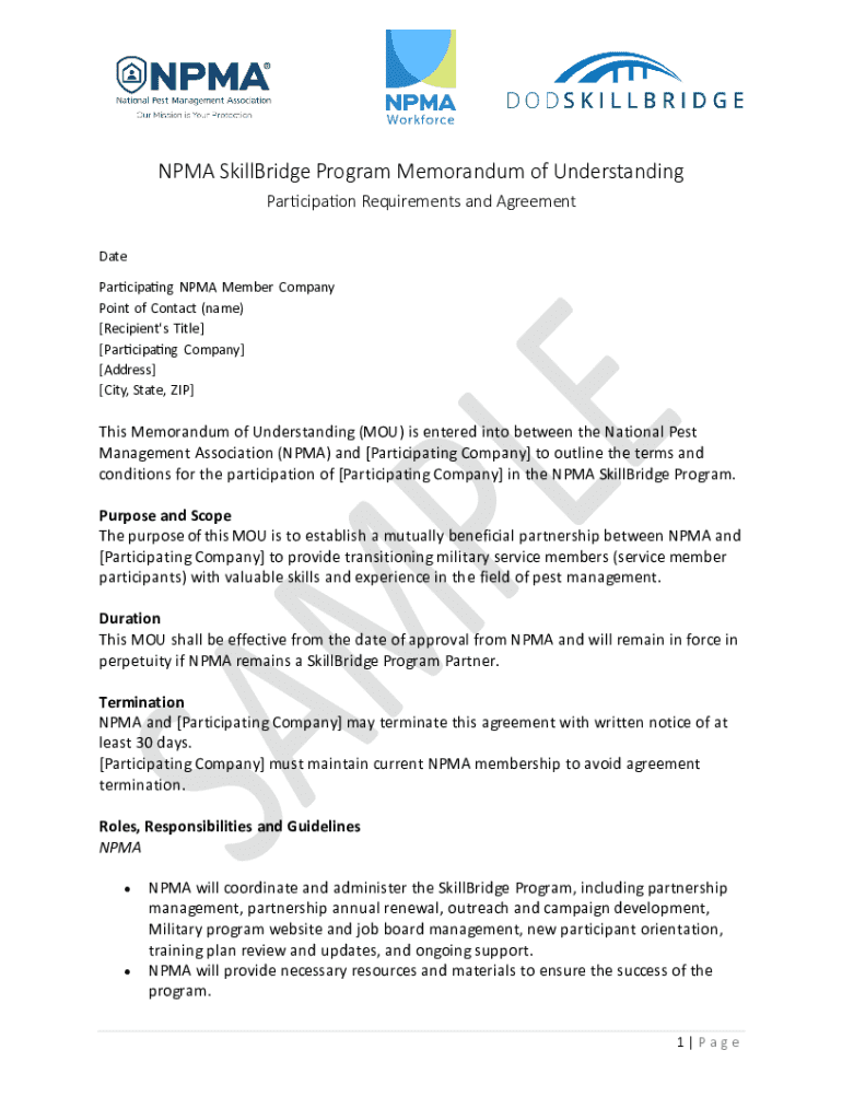 The NPMA SkillBridge Program Memorandum is a document outlining the partnership between the National Property Management Association (NPMA) and the Department of Defense (DoD) to provide transitioning service members with valuable work experience through internships in property management and related fields.