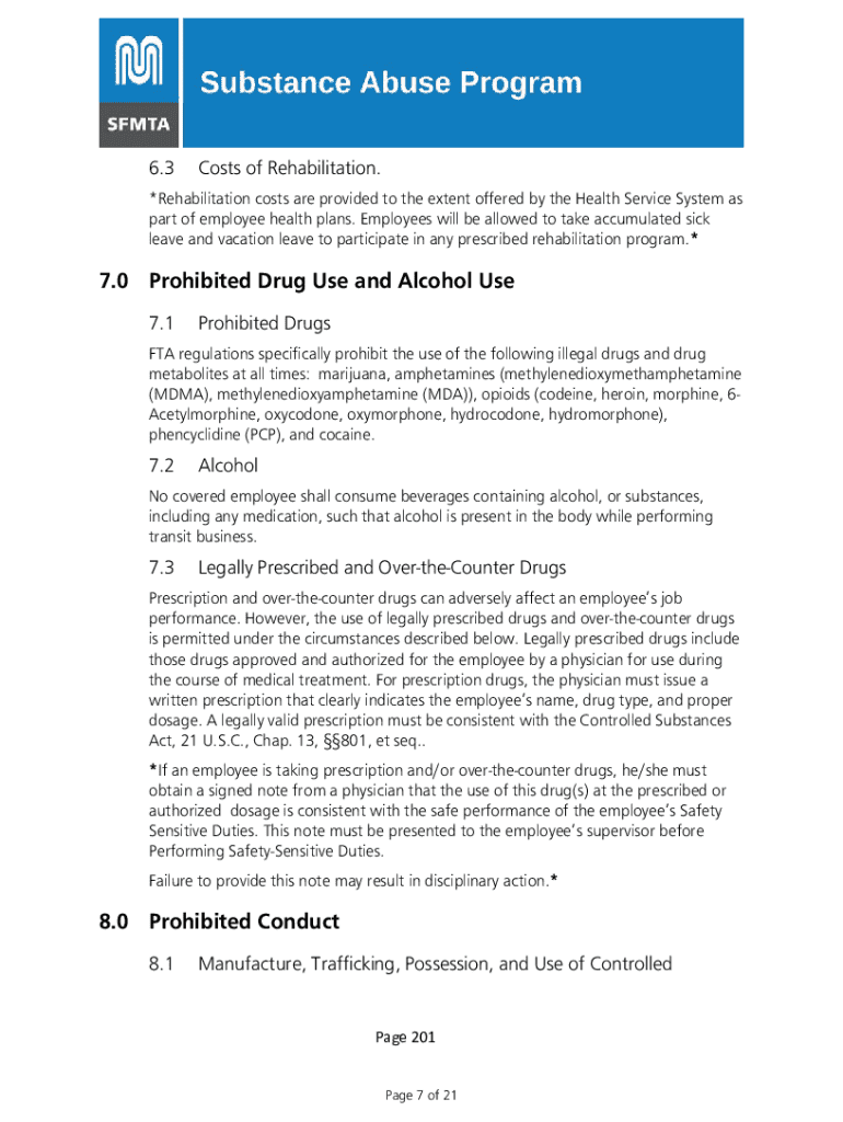 This document outlines the San Francisco Municipal Transportation Agency\'s (SFMTA) policies and procedures regarding substance abuse testing, rehabilitation programs, and prohibited drug and alcohol