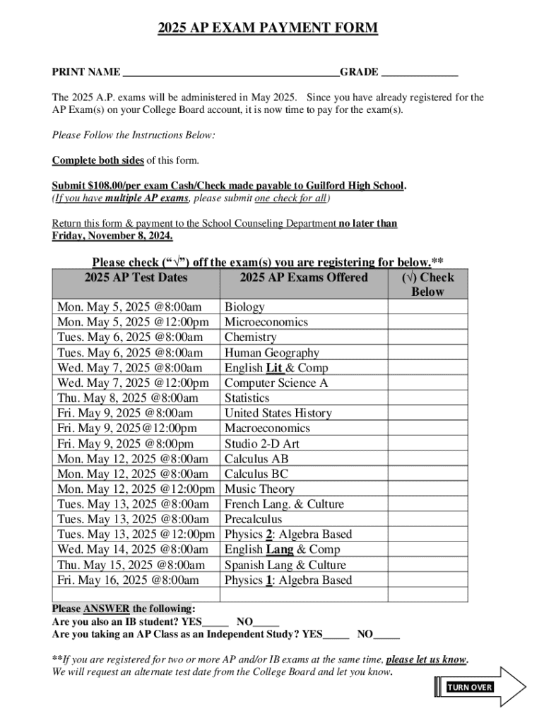 Get the free 2025 Ap Exam Payment Form - ghs guilfordps
