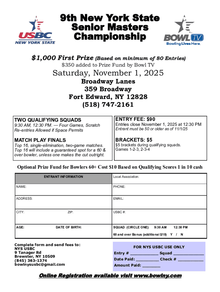 The NYS Senior Masters Championship is an event for bowlers aged 50 and over, featuring qualifying rounds, match play finals, and prize money based on entries.
