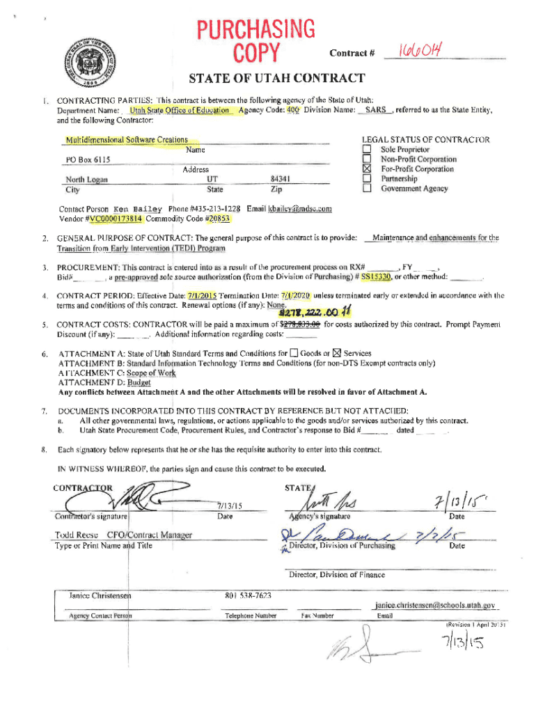 This document outlines the contractual agreement between the State of Utah and Multidimensional Software Creations for the maintenance and enhancements of the Transition from Early Intervention Data