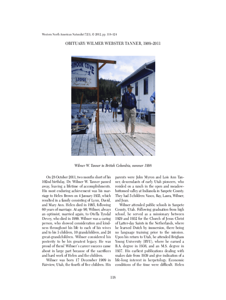 Get the free Obituary: Wilmer Webster Tanner, 1909–2011