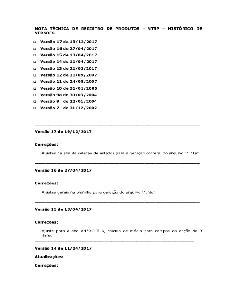 Obtenha o gratuito Nota Técnica De Registro De Produtos - Ntrp - Histórico De Versões