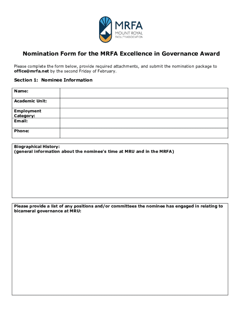 Get the free Nomination Form for the Mrfa Excellence in Governance Award