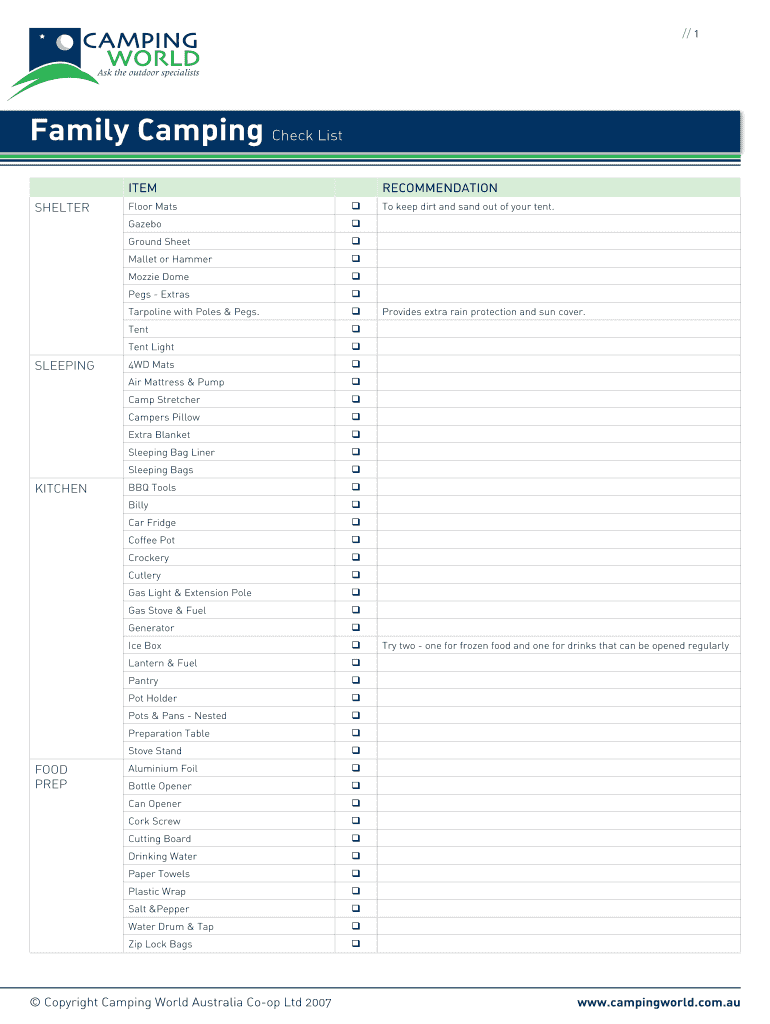 // Family Camping Check List Item Shelter Recommendation Floor Mats q Gazebo Ground Sheet q Mallet or Hammer q Ozzie Dome q Pegs Extras q Caroline with Poles & Pegs. Q Tent q Air Mattress & Pump q
