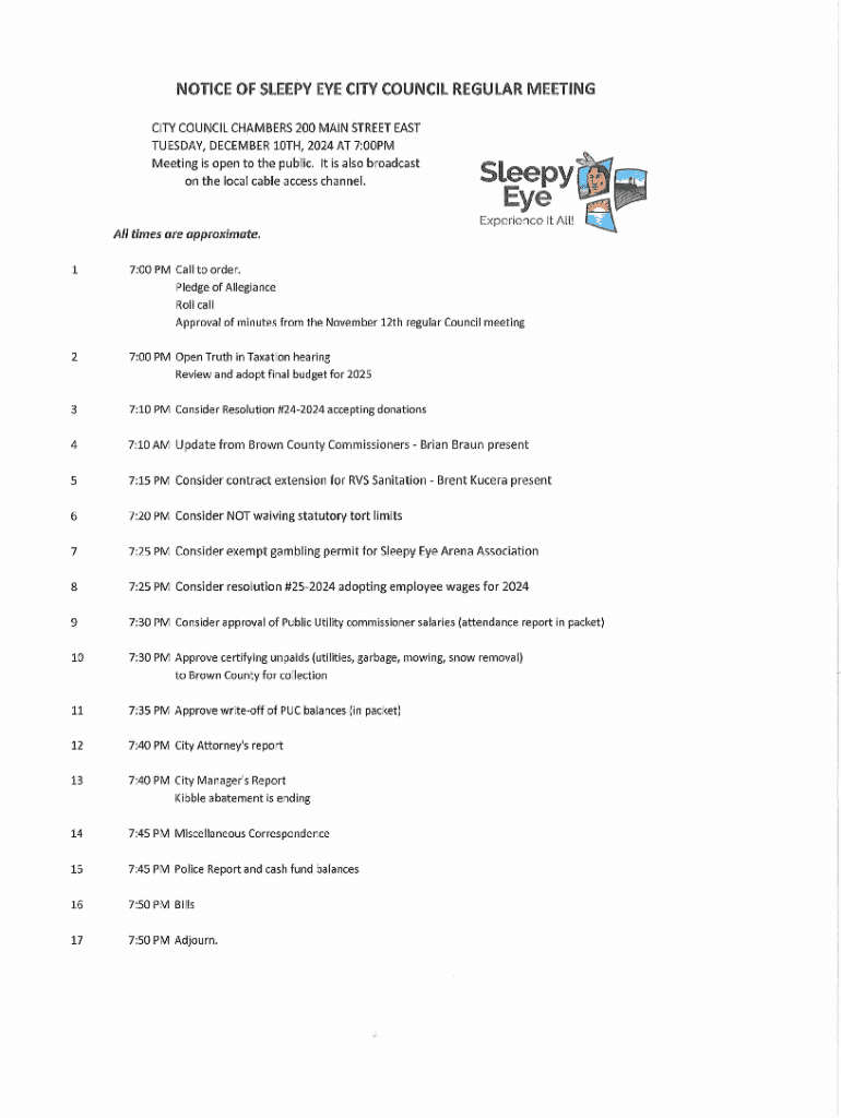 Get the free Notice of Sleepy Eye City Council Regular Meeting