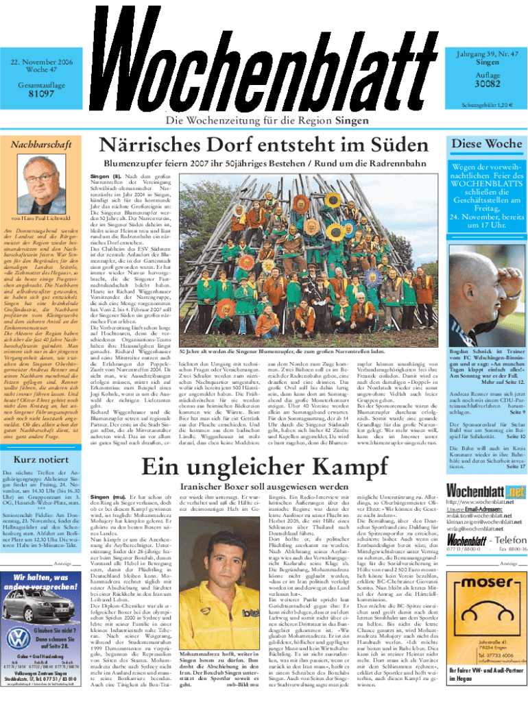 Jahrgang 39, Nr. 47 Singen22. November 2006 Woche 47Auflage30082Gesamtauflage81097Schutzgebhr 1,20 Die Wochenzeitung fr die Region Singen NachbarschaftNrrisches Dorf entsteht im Sden Blumenzupfer