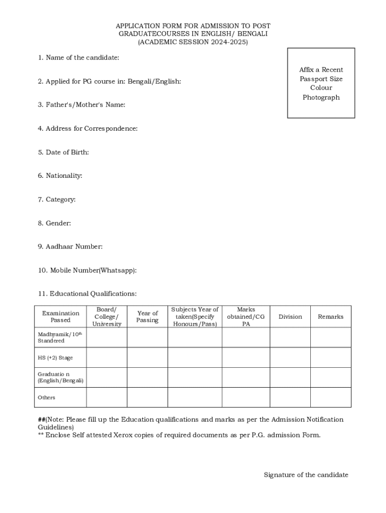 This document is an application form for candidates seeking admission to postgraduate courses in English or Bengali for the academic session 20242025. It requires personal details and educational