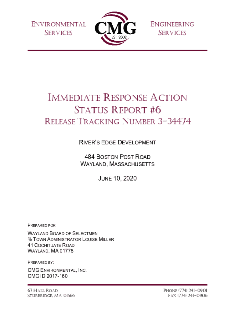 This document serves as a status report regarding the Immediate Response Action (IRA) taken at the property located at 484 Boston Post Road, Wayland, Massachusetts, addressing the release tracking