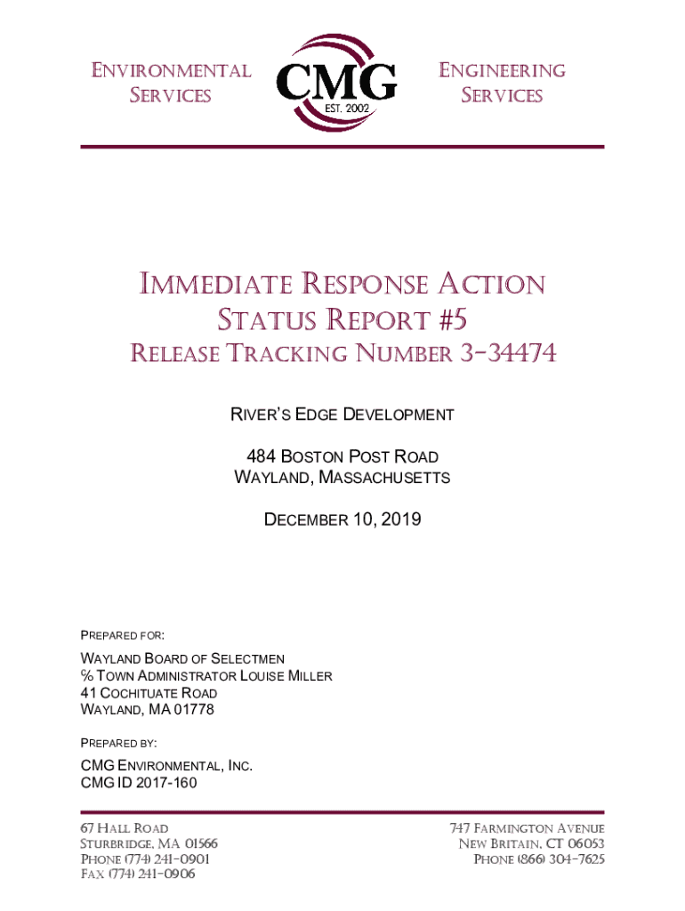 This document is an Immediate Response Action Status Report prepared for the River\'s Edge development site in Wayland, Massachusetts, detailing the status of environmental assessment and remediation