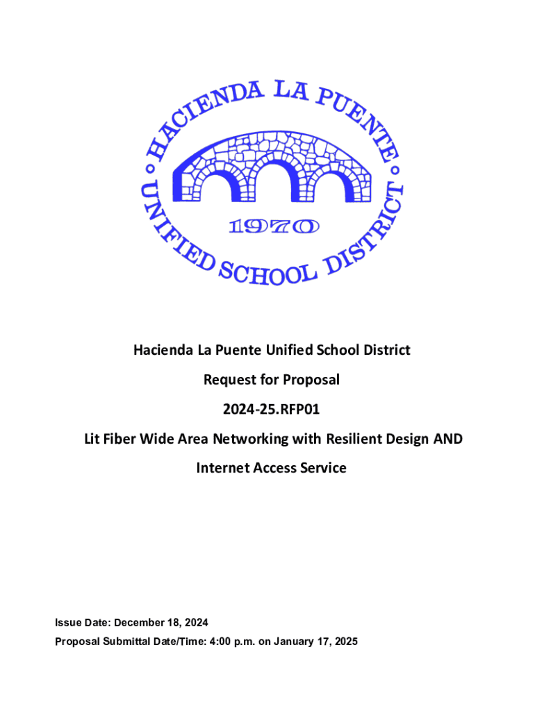 The document invites proposals for providing wide area networking services and internet access service for the Hacienda La Puente Unified School District. It includes details on bid submission, requirements,