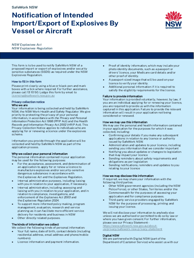 This form is to notify SafeWork NSW of a proposed import or export of explosives and/or security sensitive substances as required under the NSW Explosives Regulation.
