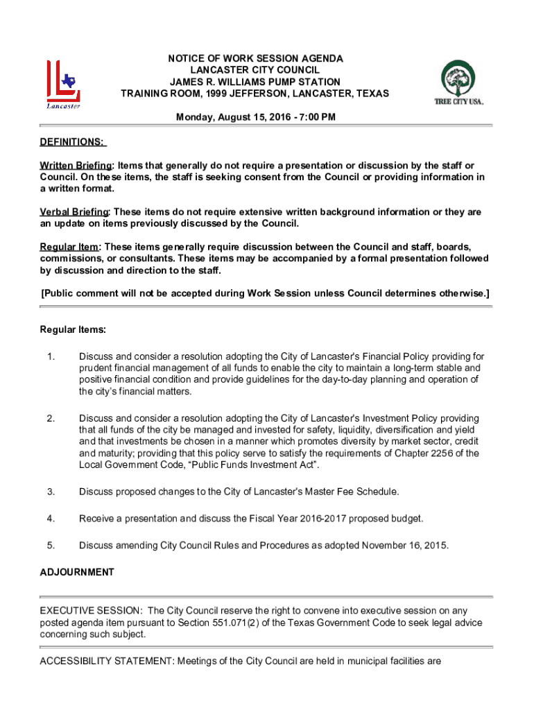 Get the free NOTICE OF SPECIAL WORK SESSION AGENDA ...