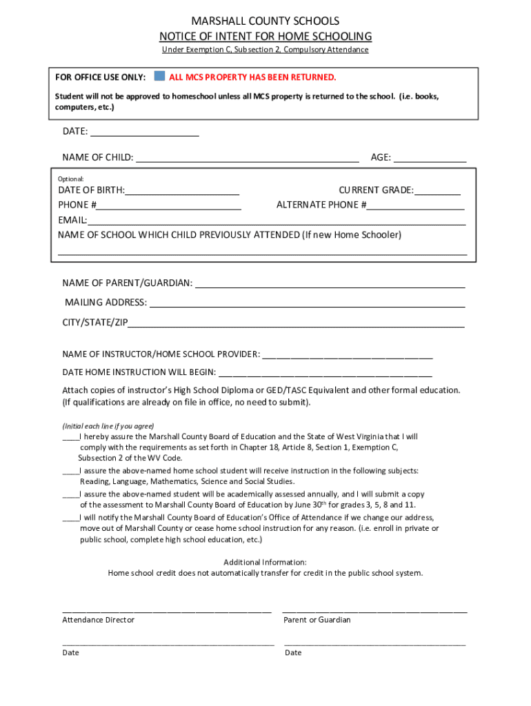 Get the free Notice of Intent for Home Schooling - marshall-k12 wvnet