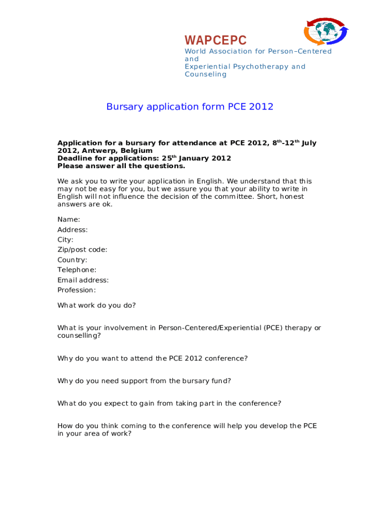 Overview of the PCE 2012 bursary application form