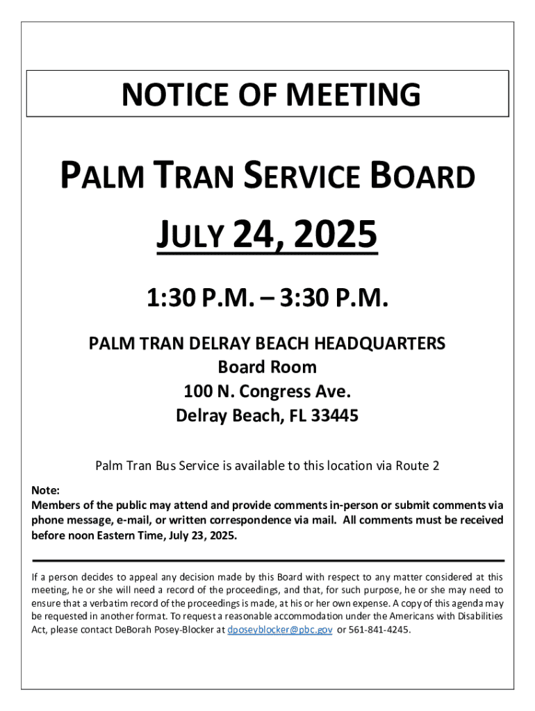 This document serves as a notice for the Palm Tran Service Board meeting scheduled for July 24, 2025, providing details about the meeting location, agenda, and public participation instructions.
