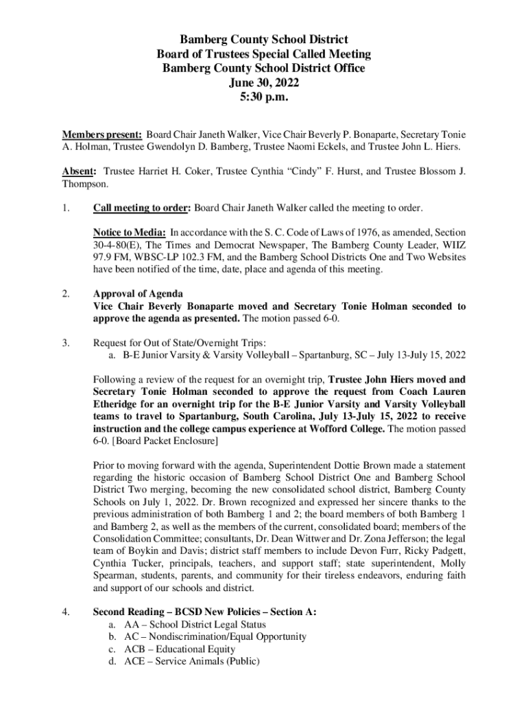 Get the free Bamberg County School District Board of Trustees Special Called Meeting Minutes