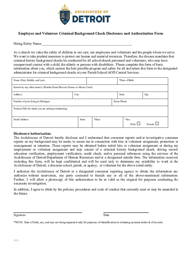 This form is used to authorize the Archdiocese of Detroit to conduct criminal history background checks for employees and volunteers who may have unsupervised contact with children or vulnerable populations.