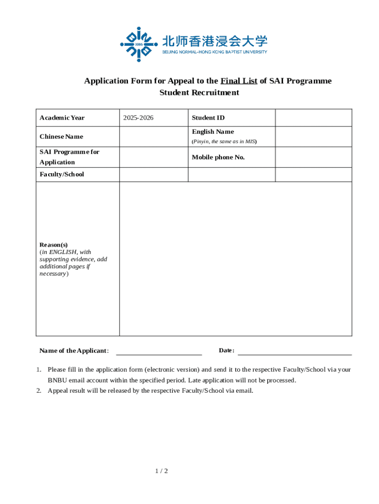 Instructions for the form Application for Appeal to the Final List of Sai Programme