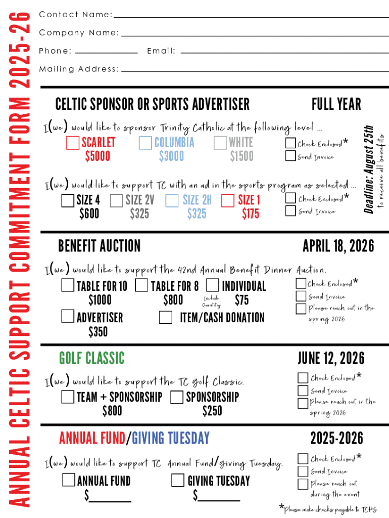 Filling out the annual celtic support commitment form may seem daunting, but breaking it down section by section simplifies the process. The first section requires personal information such as your name, contact details, and address. This information is crucial as it allows Celtic to connect with you regarding your support.