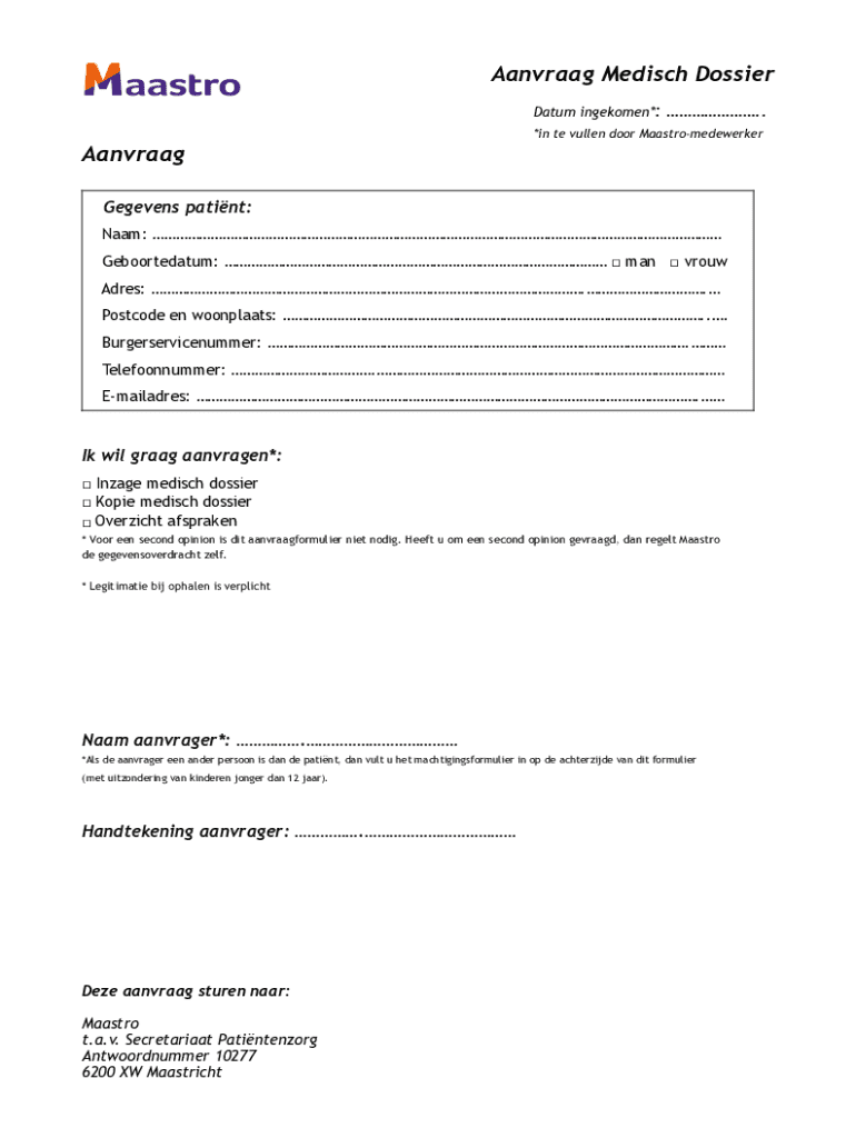 Dit document is een aanvraagformulier voor het opvragen van een medisch dossier of gerelateerde informatie van een patint.