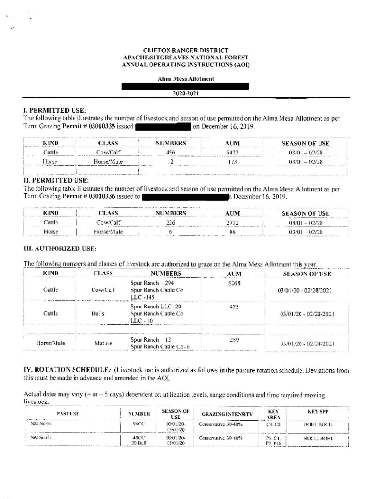 This document outlines the permitted use, authorized use, rotation schedules, grazing intensity, and management strategies for the Alma Mesa Allotment as per the grazing permits issued.