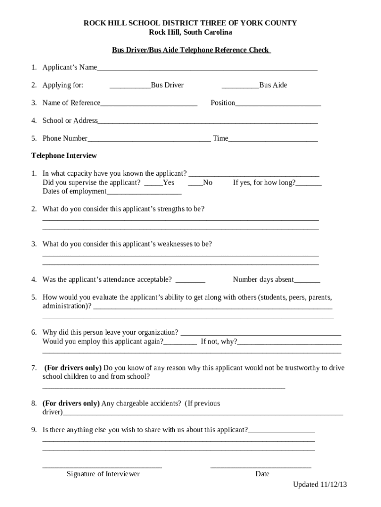 Bus Driver/bus Aide Telephone Reference Check template instructions