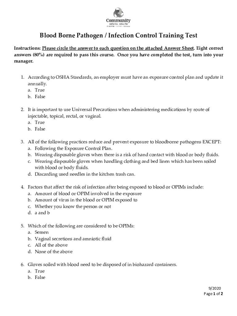 This document serves as a training test for employees regarding Blood Borne Pathogens and Infection Control measures. It includes multiplechoice questions based on OSHA standards and safe practices
