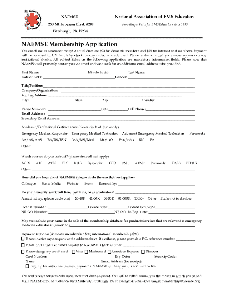 To fill out the NAEMSE membership application, you must complete the application form available on the NAEMSE website, providing personal information, professional details, and payment information if applicable.